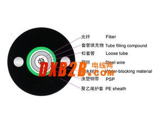 产品结构:中心PBT松套管,二根平行钢丝加强,钢--聚乙烯粘结护套
