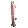 在桶槽外侧装置延伸旁路管,由旁路管外加装液位指示器,将装有磁铁的浮球放进旁路管内,因磁性色片内装着与浮球磁性相反之磁铁,所以当浮球上升时会吸引磁性色片翻动,磁性色片颜色会由白色翻为红色(或银色翻为金色),以指示实际液面高度。